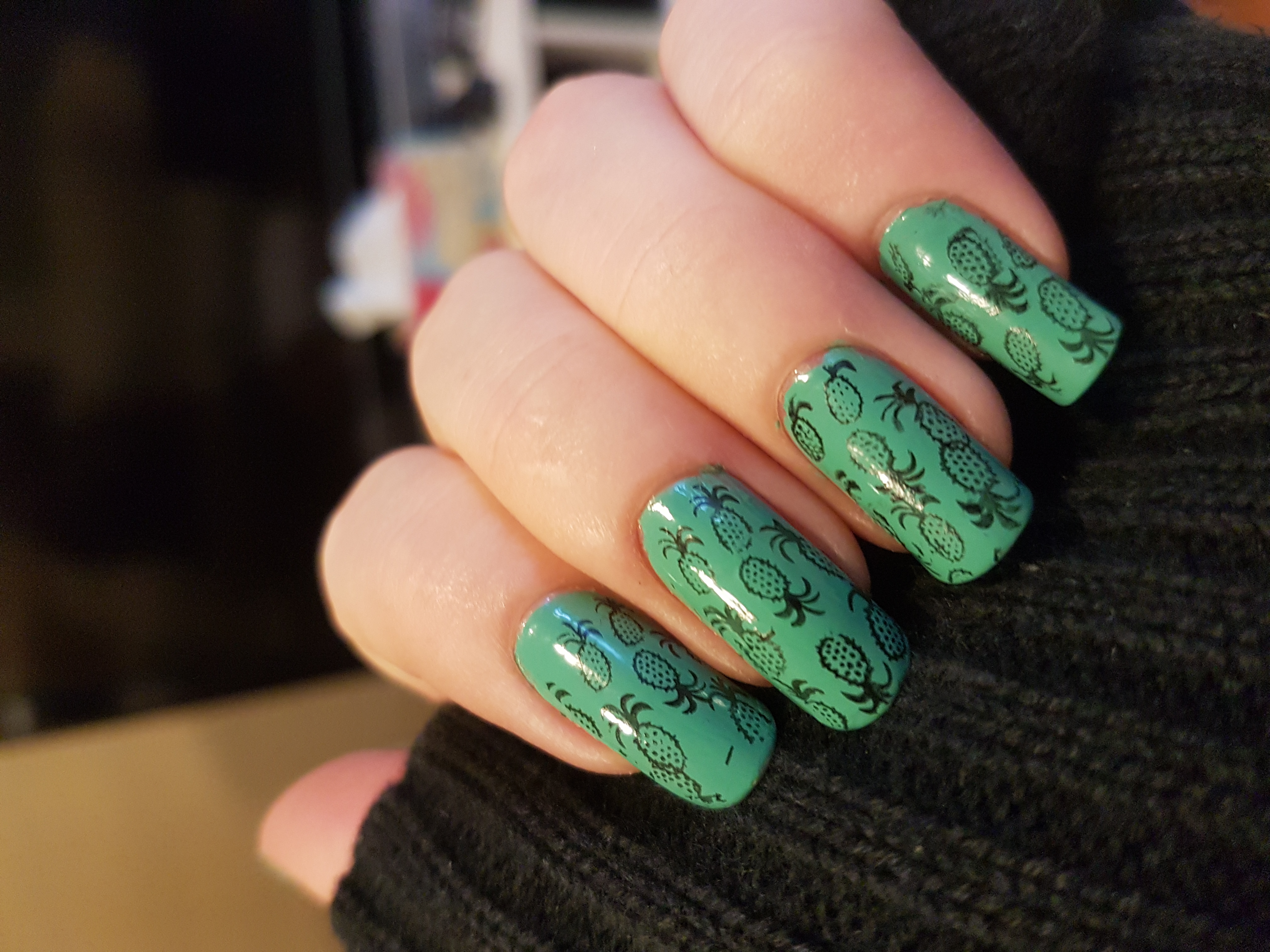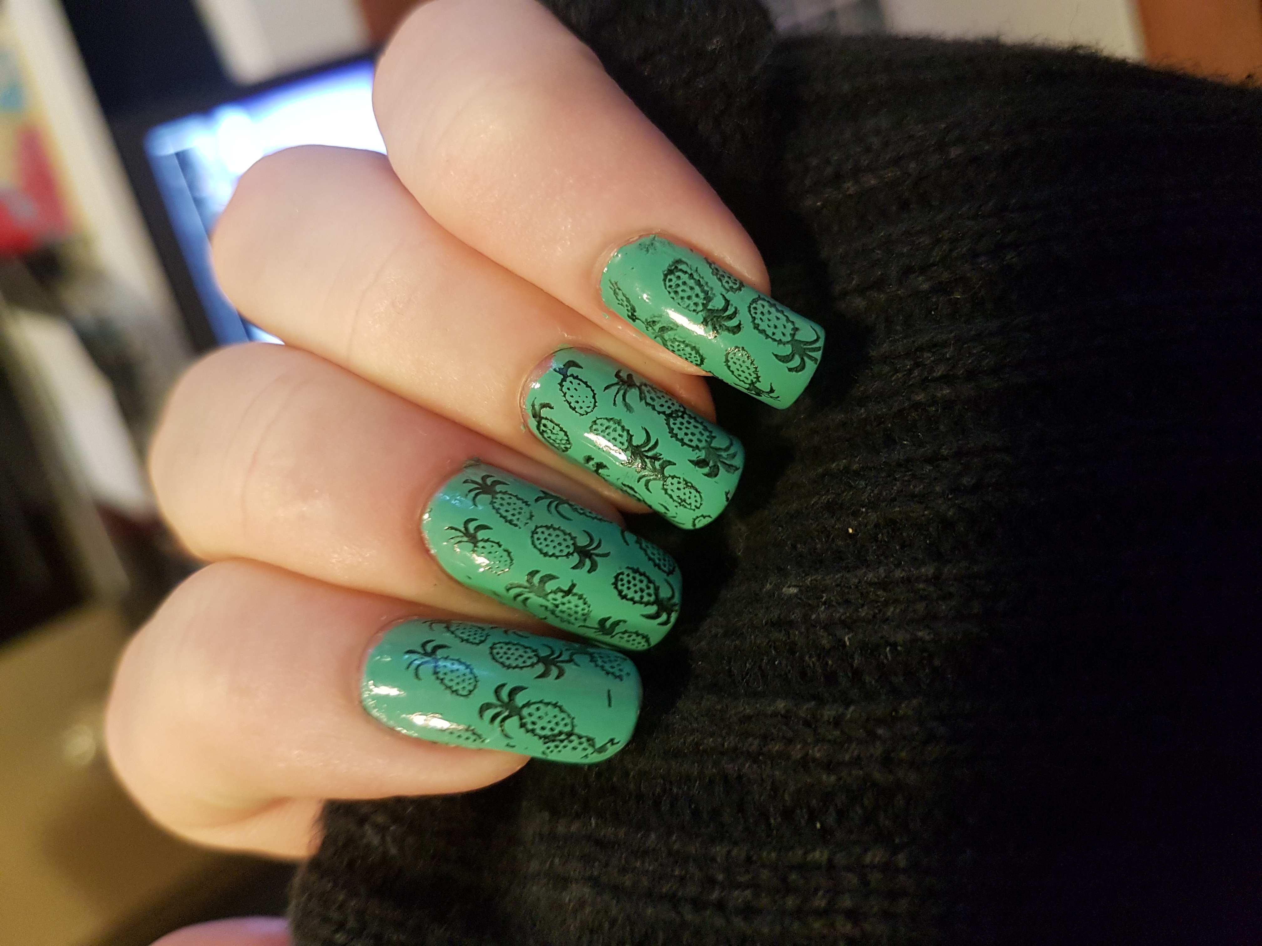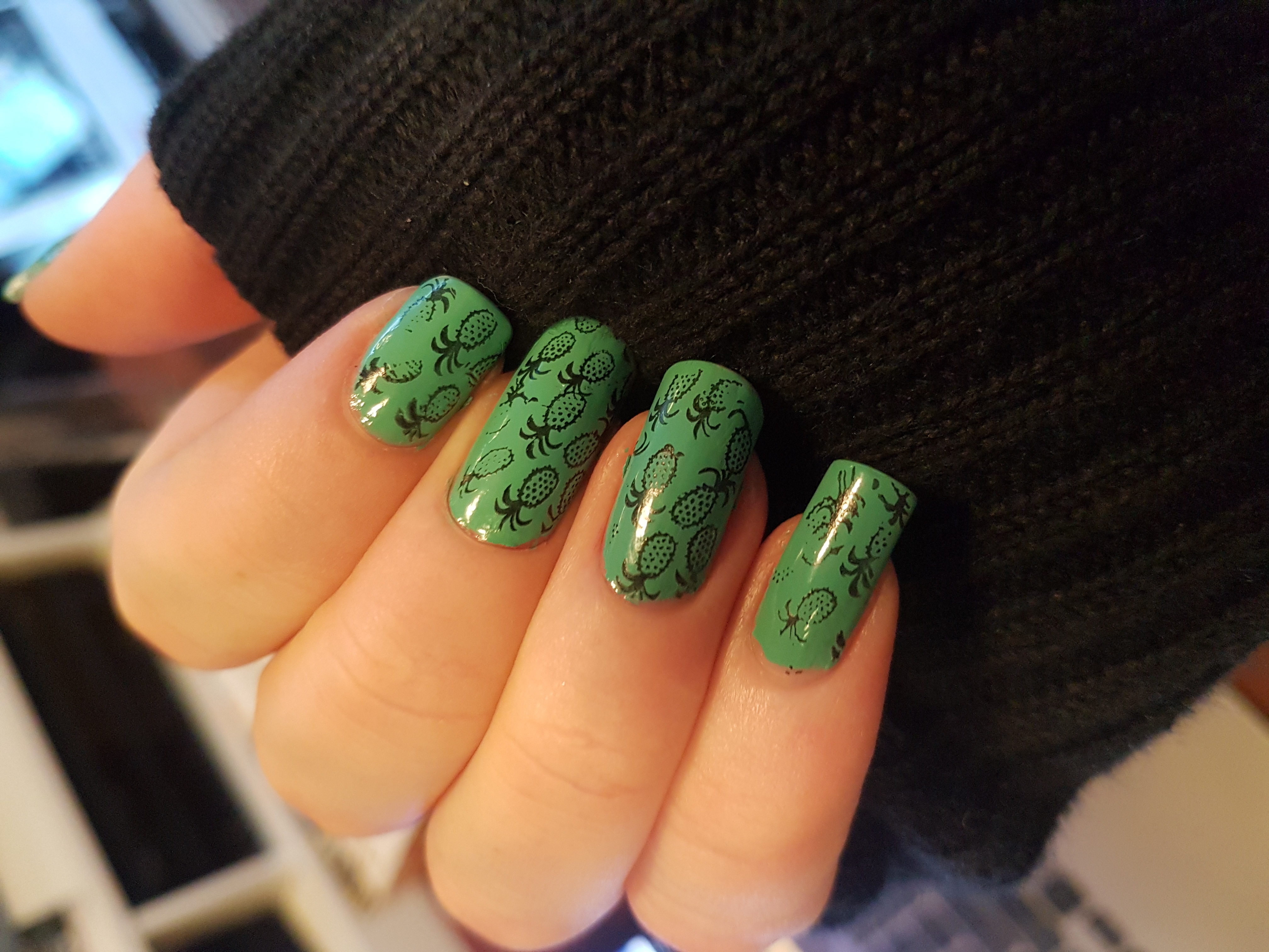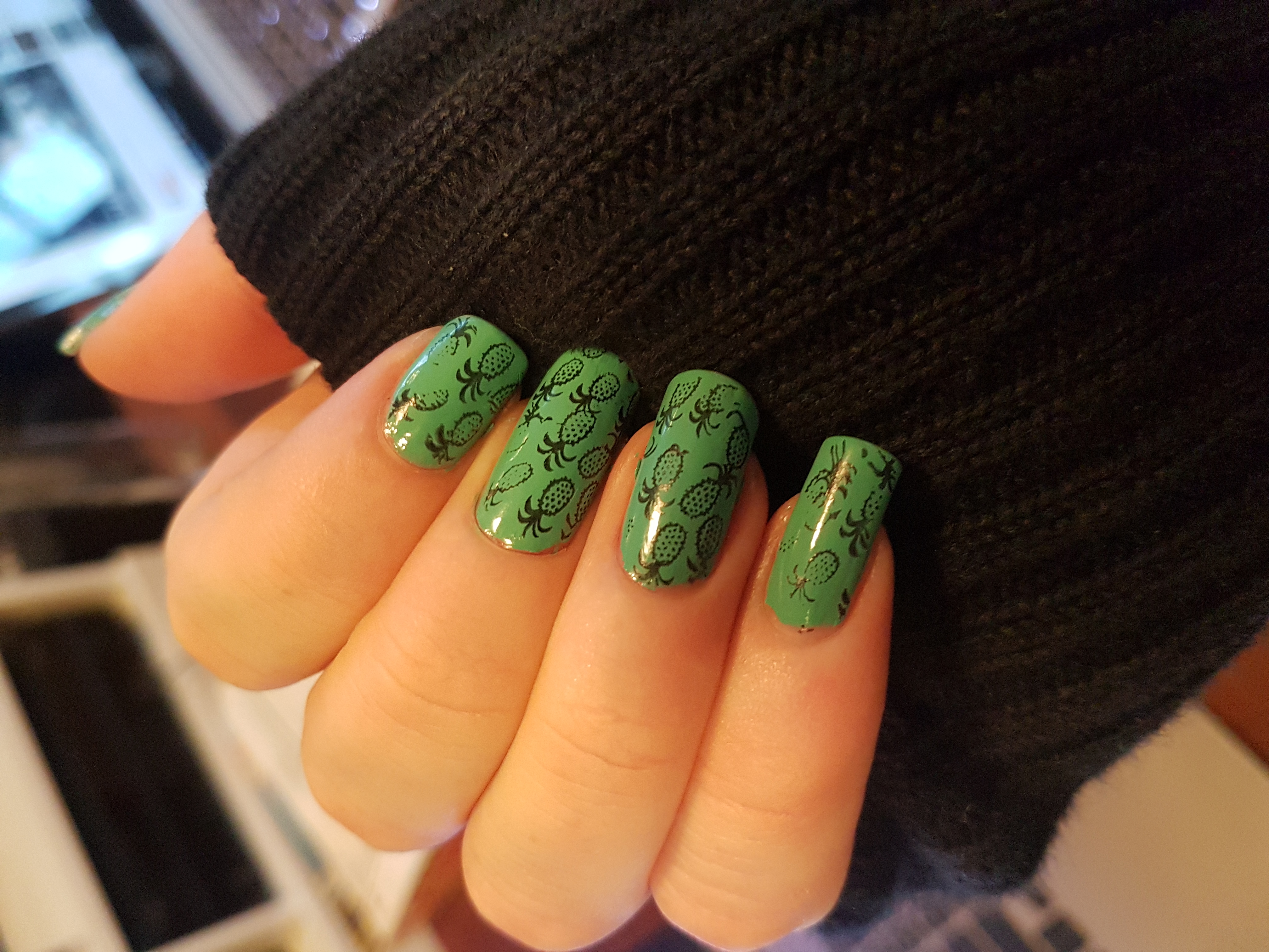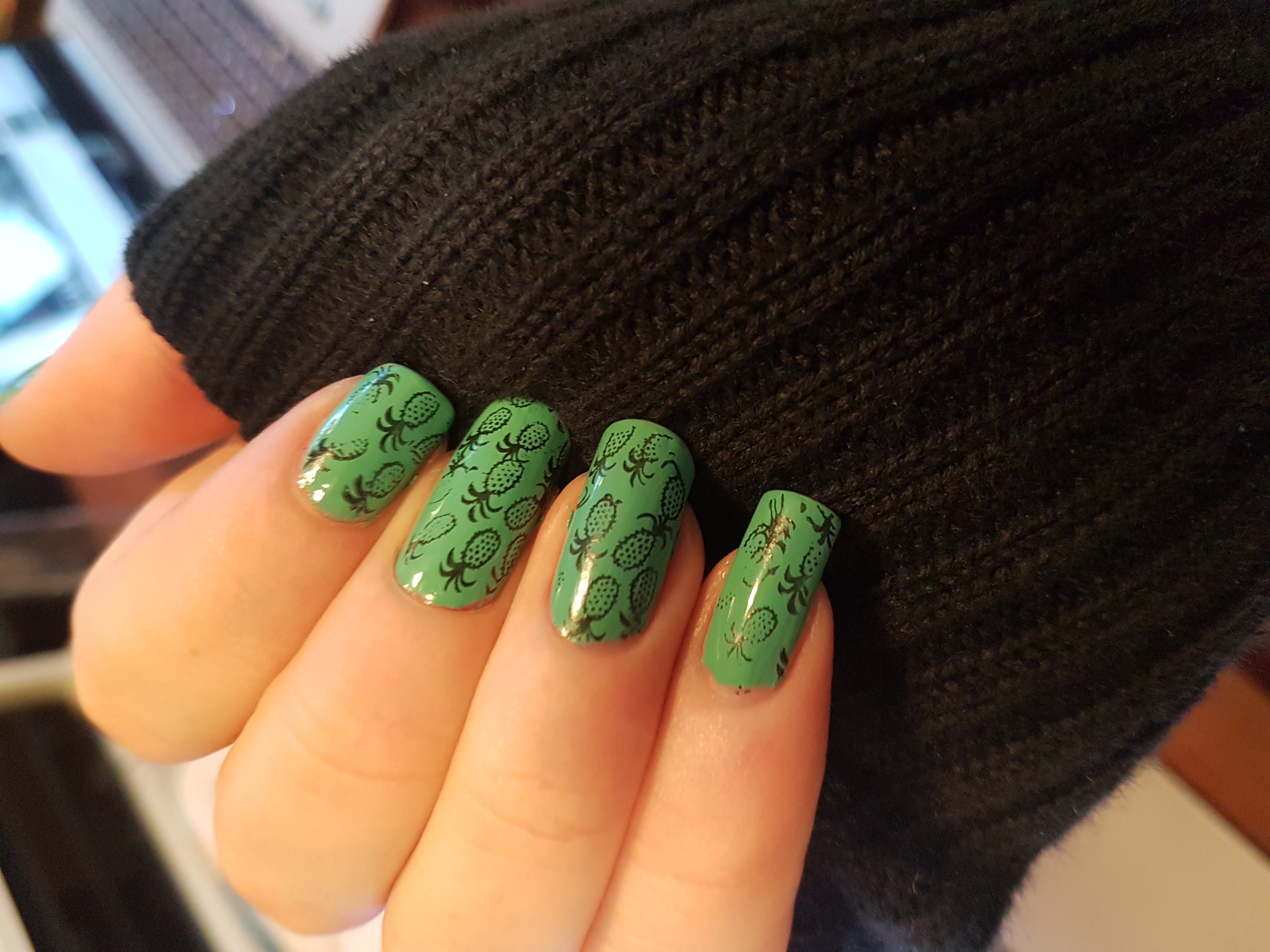 I am really happy with how this turned out. The pineapples are really cute and stamped on my nails really well. The plates were easy to use and combined with the green I feel this turned into a really fun design!